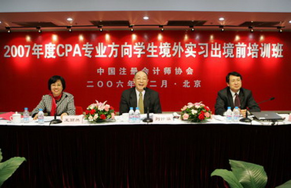 2006年12月16日-18日,中国注册会计师协会在北京国家会计学院举办“2007年度cpa专业方向学生境外实习出境前培训班”。中注协刘仲藜会长出席开班仪式并讲话。刘会长寄语大学生,珍惜和把握实习机会;全面锻炼,增长才干;遵守纪律,树立好形象。陈毓圭秘书长以“注册会计师行业形势和发展战略”为题,为学生讲授了第一课。培训班内容包括:注册会计师职业内涵、国际会计公司运作、外事礼仪、国际沟通能力指引和外事要求等丰富内容。